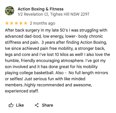 Action boxing & fitness is proud of the fact that we have attracted a very down to earth (maybe because there's no mirrors in here:) and friendly bunch of clients that train hard but well together in a supportive environment. In the session, you will spend time throwing punches into a boxing bag. One of our experienced boxing coaches will instruct you on which punches to throw, and they will ensure that you use the correct technique. You will also spend time using equipment such as kick pads, medicine balls, skipping ropes, kettlebells, power bags, battle ropes, and more. Your experienced coach will ensure that you understand the exercises and that you're using the correct technique.